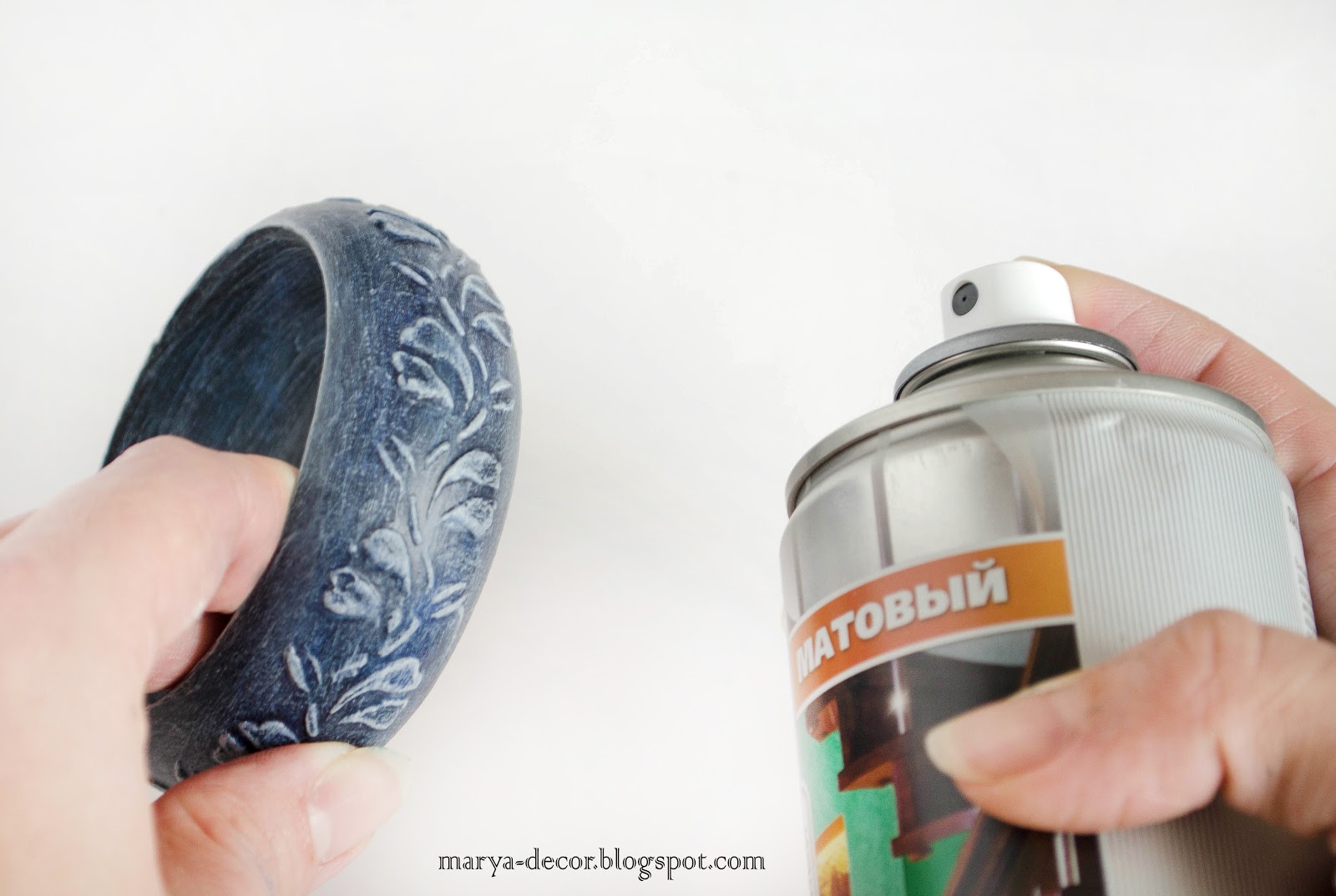 19. После высыхания наносим матовый акриловым лак в аэрозоле на браслет с внешней стороны в несколько слоев с промежуточной просушкой.